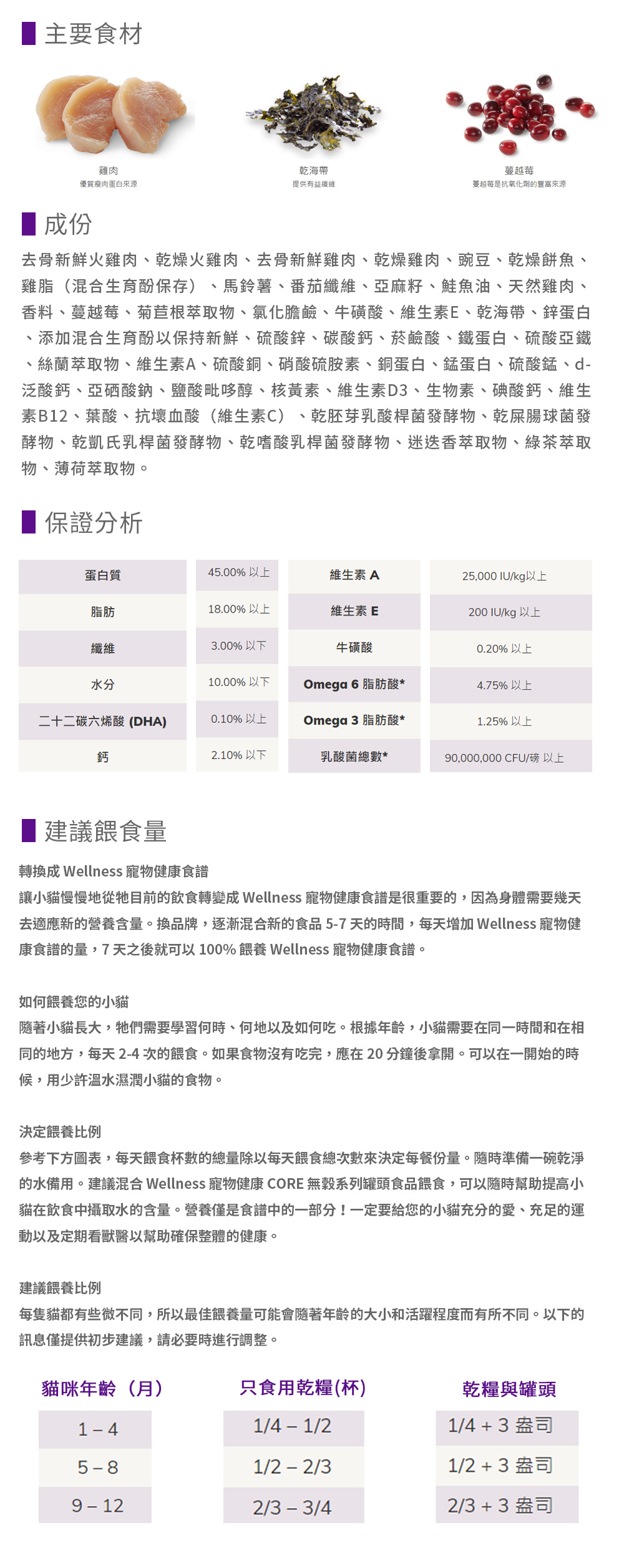 *幼貓專屬的無穀食譜,由雞肉、火雞、白魚、鮭魚油和蔓越莓製成,有助於支持您的小貓的最佳健康,包括幫助皮膚和皮毛健康,為幼貓的成長與健康奠定基礎。