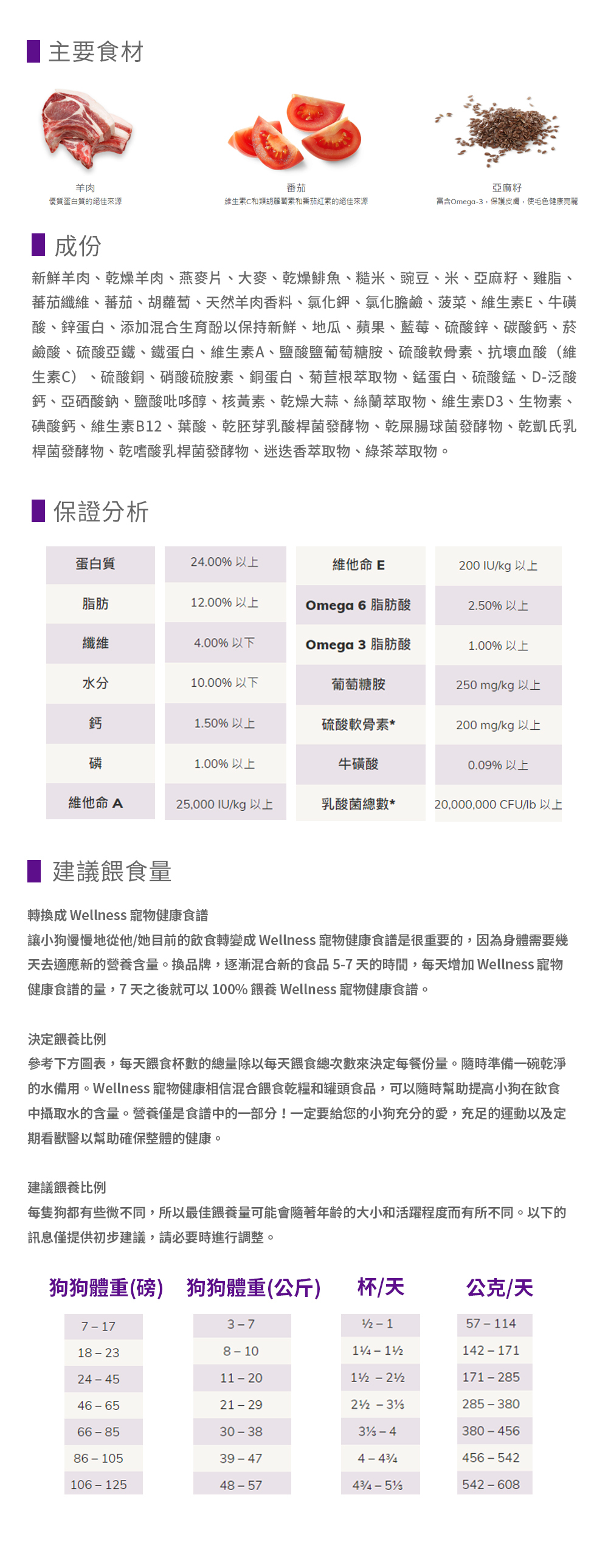 *Wellness Complete Health 使用優質蛋白質和穀物,提供均衡的飲食,富含您的狗一生所需的營養。