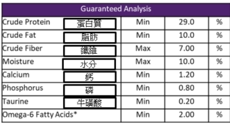 成分: 去骨雞肉、全麥、小雞肉粉、大麥、雞脂肪、乾甜菜漿、燕麥纖維、蔓越莓、天然香料、氯化膽鹼、氯化鉀、維生素E補充劑、L-抗壞血酸-2-磷酸酯(維生素C來源)、牛磺酸、混合生育酚(用於保持新鮮)、菸鹼酸、蛋白鋅、硫酸亞鐵、硫酸鋅、蛋白鐵、維生素A補充劑、硝酸硫胺明(維生素B1)、亞硒酸鈉、D-泛酸鈣、硫酸銅、鹽酸吡哆醇(維生素B6)、硫酸錳、蛋白錳、蛋白銅、核黃素(維生素B2)、生物素、維生素D3補充劑、維生素B12補充劑、葉酸、碘酸鈣、抗壞血酸(維生素C)、乾燥屎腸球菌發酵產物、乾燥地衣芽孢桿菌發酵產物、乾燥枯草芽孢桿菌發酵產物、迷迭香萃取物、綠茶萃取物、綠薄荷萃取物。